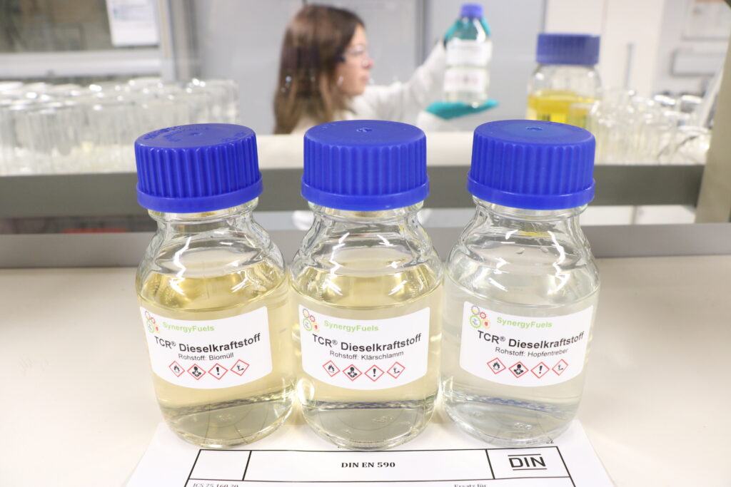 Im Projekt SynergyFuels wurden aus Klärschlamm, Biomüll und Hopfentreber innovative Dieselkraftstoffe entwickelt. Fraunhofer UMSICHT in Sulzbach-Rosenberg setzt hierfür das eigens entwickelte TCR-Verfahren ein – einen Pyrolyseprozess mit integrierter Aufwertung der Produkte, insbesondere des Pyrolyseöls. Durch gezielte Optimierungen im Hydrierungsprozess des Öls konnten Verunreinigungen beseitigt werden, sodass die Kraftstoffe eine gute Ausgangsqualität erreichen.